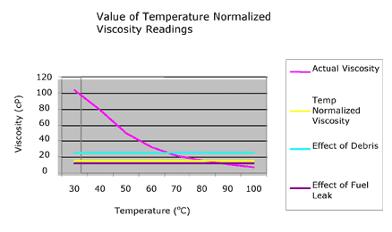 幸運(yùn)的是,油和許多其它液體溫度之間的關(guān)系表現(xiàn)出的特點(diǎn)和粘度。這些關(guān)系都是容易數(shù)學(xué)建模,允許溫度補(bǔ)償粘度粘度對任何點(diǎn)計(jì)算在選擇的參考溫度。附表1,例如,參考溫度設(shè)定在80°C。每個(gè)數(shù)據(jù)點(diǎn)粘溫然后重新計(jì)算數(shù)學(xué)假設(shè)參考溫度。在這個(gè)展覽,10 W30石油顯示了一個(gè)溫度補(bǔ)償?shù)恼扯?/span>TCV)在80年的18°C cP的參考溫度在整個(gè)范圍的瞬時(shí)溫度和黏度測定值。閱讀超過黃線表示一個(gè)thicker-than TCV 10 W30理想灌裝,可能引起一種類型的碎片或另一個(gè)。然而,紫色TCV線表示低于目標(biāo)的粘度這可能造成燃料或冷卻劑泄漏。調(diào)整粘溫值允許在原油粘度TCV趨勢被發(fā)現(xiàn)很容易。