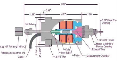 SPL440型探頭安裝在高壓泵經過的系統。兩端都有HIP HF4型接頭配合一個9/16-28的螺紋使用。SPL440型探頭可以連續使用壓力高達20000PSI ,靜止測量可達30000PSI .