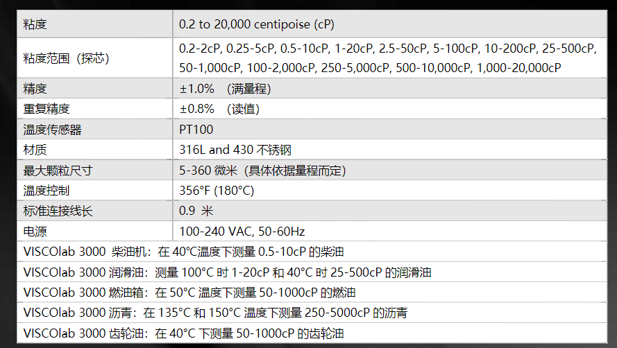 小樣品粘度計集成了一個電子加熱器和綜合的溫度控制系統,可提供連續的粘度和溫度讀數可在12個20:1粘度范圍內進行測量。粘度可顯示為CP或CST,溫度可顯示為°C或°F。集成溫度控制允許用戶在高于環境溫度至356°F(180°C)和高于環境溫度至-40°C的任意設置下進行測量,并配備可選的冷卻套。該傳感器易于現場校準。可以預先校準多個工作范圍和產品設置。數據可以通過RS-232串行端口輸出到PC,用于跟蹤、存儲或圖形顯示。電子設備允許用戶定義溫度和粘度顯示單位、數據平均間隔、密度等。電子設備還提供數字讀數,以及樣本穩定性的統計數據,使測試和操作員之間具有更大的重復性。主要特征易于使用和維護  cP和cst的數字顯示  存儲多達40個特定于產品的測試設置  可拆卸的溫控循環套和蓋子增強功能  所需液體少于2ml,最大限度地減少產品浪費  需要少量的工作臺空間  便攜  內部加熱器,用于溫度控制在40/50/100/135/150°C等各種條件高精度和可靠性  軟件多次測量樣品,直到標準偏差小于0.2%,然后根據ASTM D7483顯示粘度值適用范圍0.2至20000cP的粘度測量值標準方法符合ASTM D7483標準 相關于ASTM D445標準。